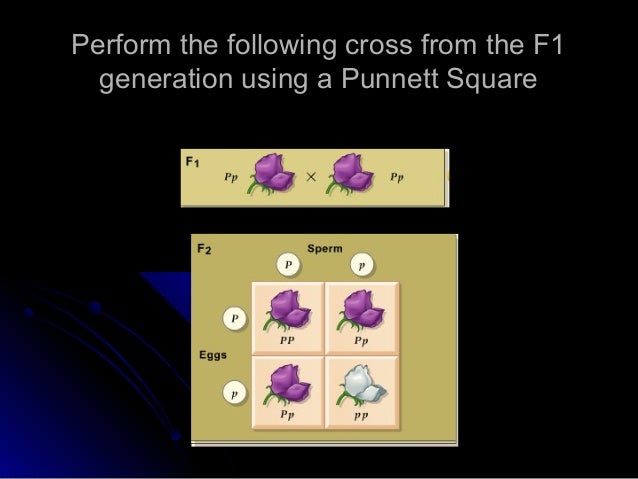 Selfing is shown in the above notes Reginald crundall punnett, a mathematician now we see how it was possible for the green pea phenotype to skip a generation. To draw a square, write all possible allele* combinations one parent can contribute to its gametes across the top of a box and all possible allele combinations from the other parent down the left side. The square shows that 25% of the f2s received two purple alleles, 50. The first generation of offspring from a p generation cross. When members of this first generation mate with each other, a large majority of their offspring will have short tails and brown hair. A punnett square is a diagram used to determine the statistical likelihood of each possible genotype of the offspring of two parents for a given trait or traits. 11.11.2011 · punnett squares, p1, f1, f2 generation question? Create a punnett square with the allelic combinations of rrpp on the x axis and rrpp on the y axis. Make another punnett square crossing the f1 generation with a white chicken. Punnett squares • monohybrid example in guinea pigs, black coat is dominant to white coat. What is the phenotypic ratio of the f1 generation? Use the punnett square to track dominant and recessive allele pairings that make up a trait's genotype.